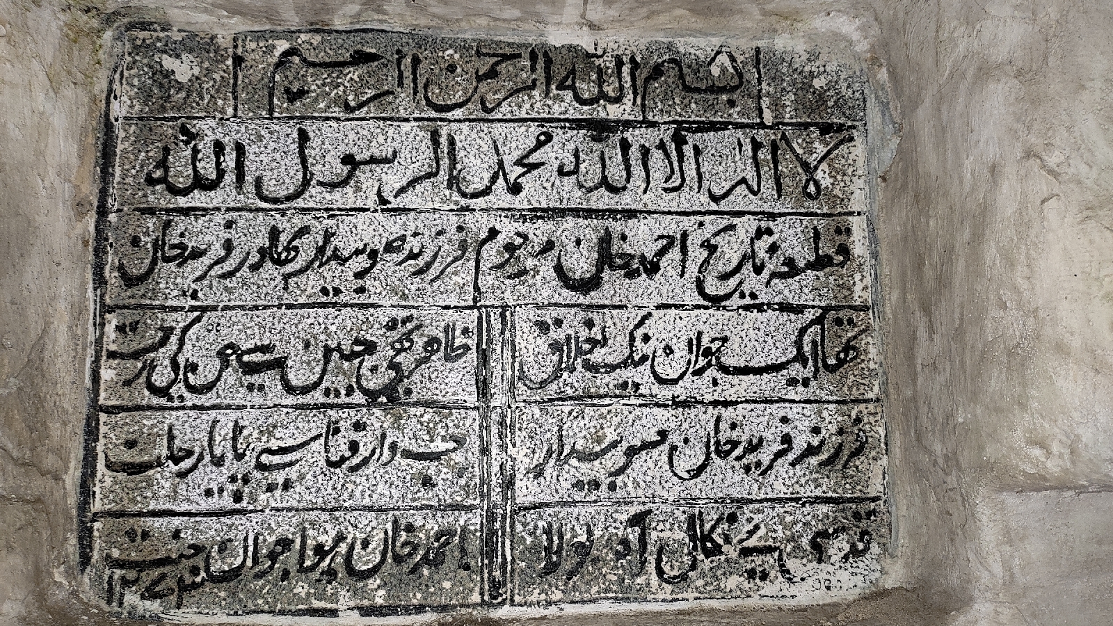 In the name of Allah the most beneficient and merciful as date of this inscription mentioned on this tomb of late Ahmed Khan, the son of subedar Bahadur Farid Khan who was a very good young man and he went to his final abode in heavens in year 1856.